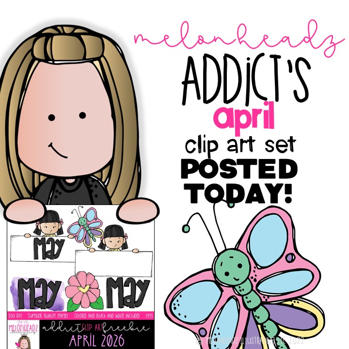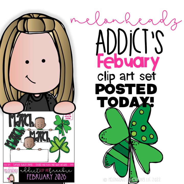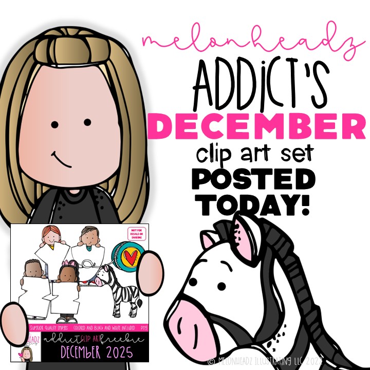 I LOVE Melonheadz Kidlettes!! I don’t really remember how I came across Nikole’s drawings, but I instantly fell in love with them, and through the years, they just get better and better! I asked for a lifetime membership for Christmas one year and that is how I officially became an Addict! While I am no longer in a classroom, I use the clipart for card making for family members and graphics for my Facebook posts. If I ever go back into the classroom, I will definitely have a Melonheadz theme!