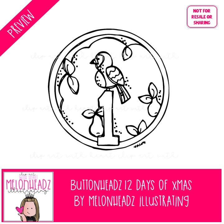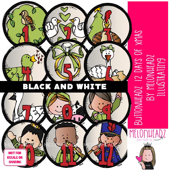 Buttonheadz clip art, 12 Days of Christmas clip art BLACK AND WHITE: This illustrated set contains all of the clip art images as shown in the preview picture. BLACK AND WHITE illustrations included.