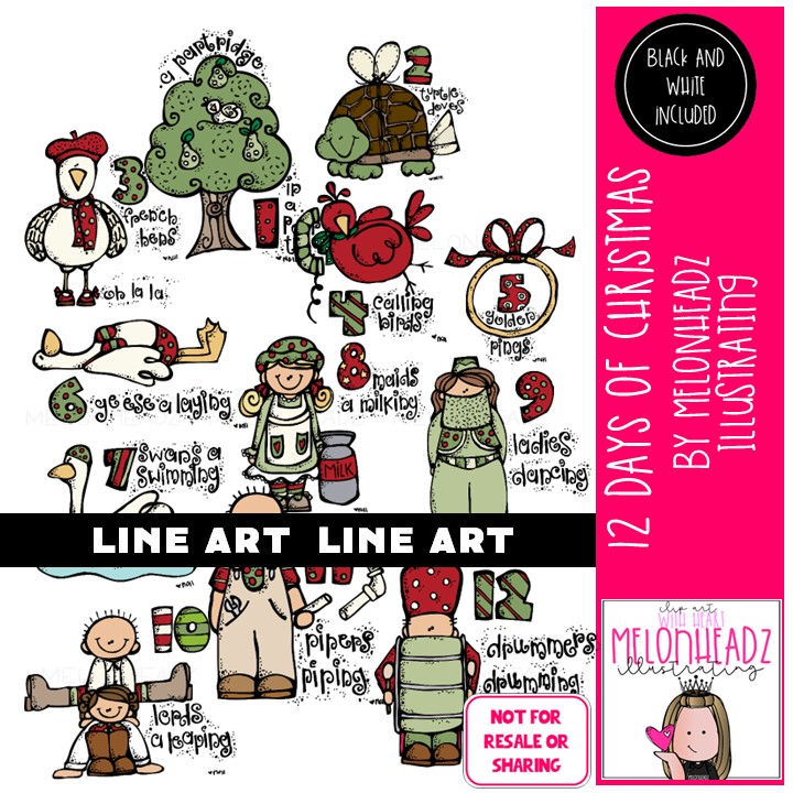 12 Days of Christmas clip art LINE ART and BLACK AND WHITE: This illustrated set contains all of the clip art images as shown in the preview picture. LINE ART and BLACK AND WHITE illustrations included.