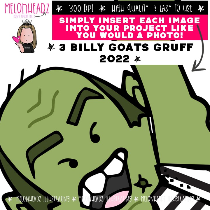 3 {Three} Billy Goats Gruff clip art 2022, Ogre clip art, literature clip art COLORED Version