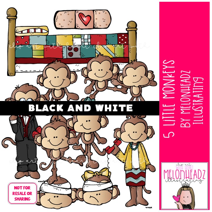 5 Little Monkeys clip art Literature clip art Book Companion clip art BLACK AND WHITE: This illustrated set contains all of the clip art images as shown in the preview picture. BLACK AND WHITE illustrations included.