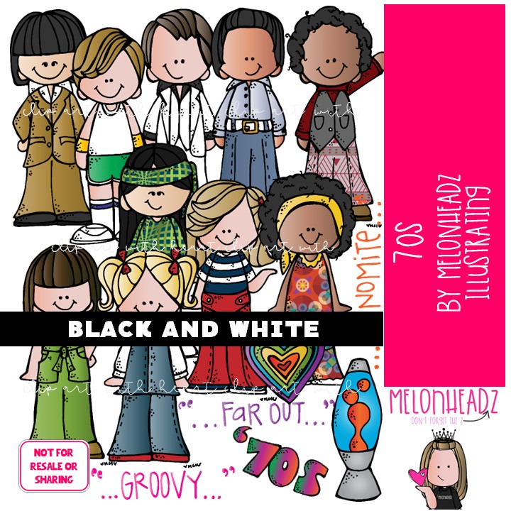70s clip art, 1970 fashion clip art, Kidlette clip art BLACK AND WHITE: This illustrated set contains all of the clip art images as shown in the preview picture. BLACK AND WHITE illustrations included.