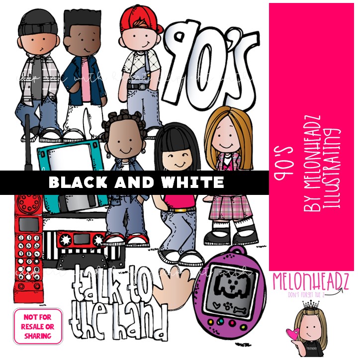 90s clip art, 1990 fashion clip art BLACK AND WHITE: This illustrated set contains all of the clip art images as shown in the preview picture. BLACK AND WHITE illustrations included.