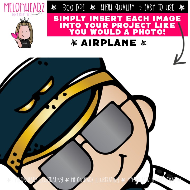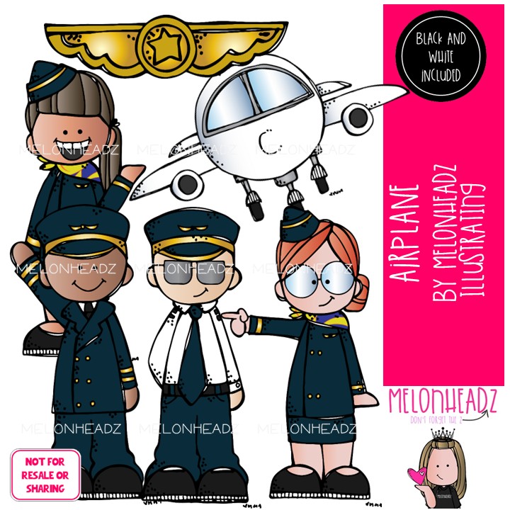 Airplane clip art 1, pilot clip art, flight attendant clip art Mini: This illustrated set contains all of the clip art images as shown in the preview picture. COLORED and BLACK AND WHITE  illustrations included.
