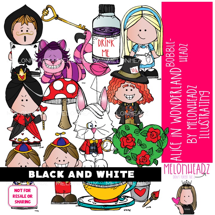 Alice in Wonderland clip art, Bobbleheadz clip art BLACK AND WHITE: This illustrated set contains all of the clip art images as shown in the preview picture. BLACK AND WHITE  illustrations included.