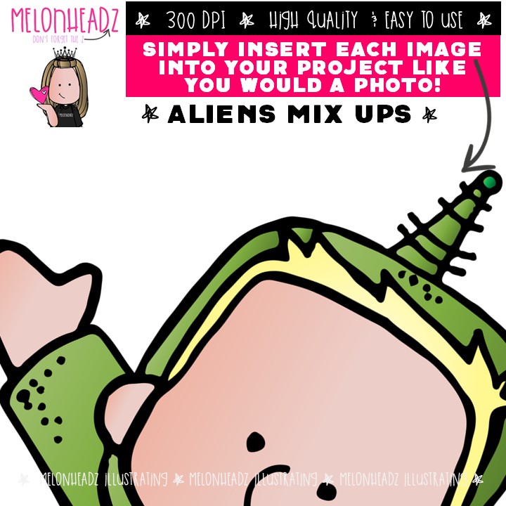 Aliens Mix Ups clip art, Space clip art COLORED Version: This illustrated set contains all of the clip art images as shown in the preview picture. COLORED illustrations only.