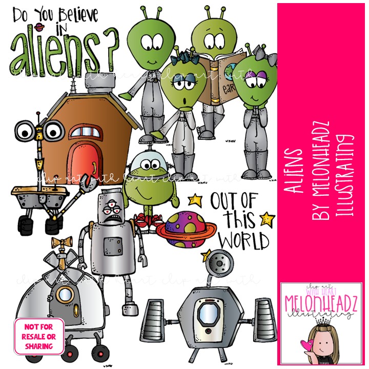 Aliens clip art, Space cclip art, Robots clip art COLORED Version: This illustrated set contains all of the clip art images as shown in the preview picture. COLORED illustrations only.