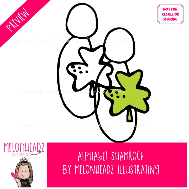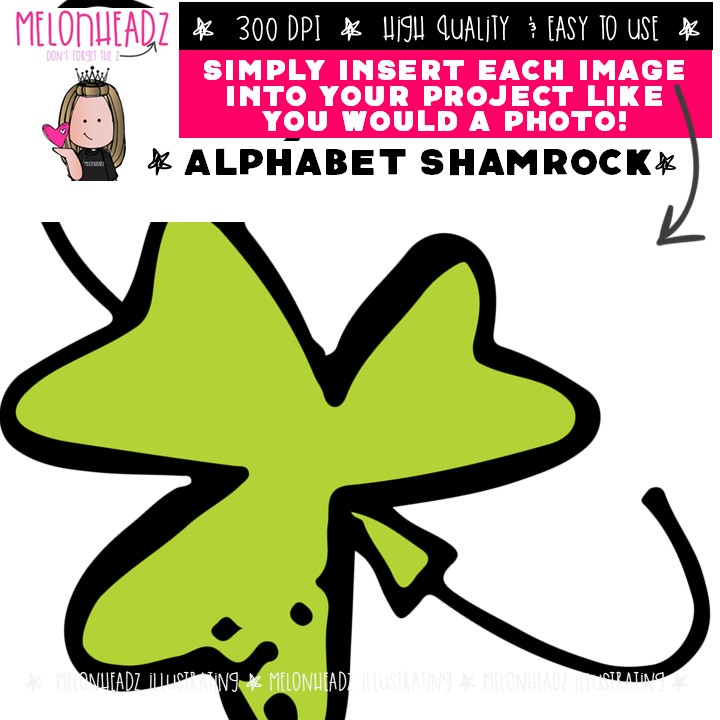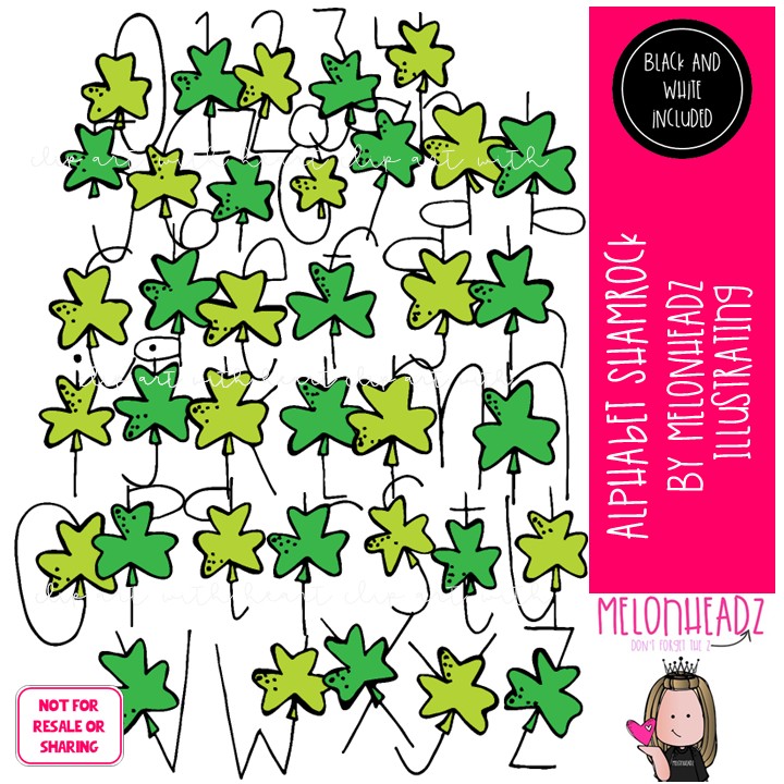Alphabet Shamrock clip art, St. Patrick’s Day clip art COMBO PACK: This illustrated set contains all of the clip art images as shown in the preview picture. COLORED and BLACK AND WHITE illustrations included.