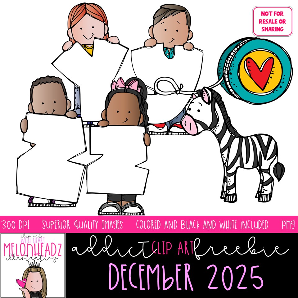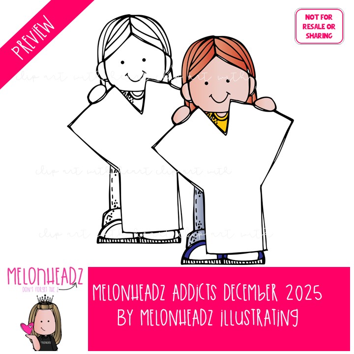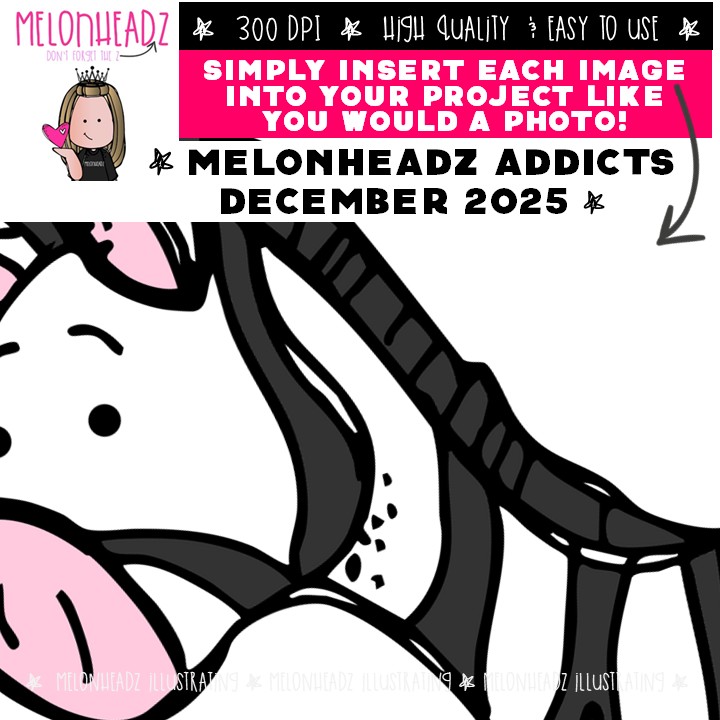 Melonheadz Addicts December 2025 clip art, Alphabet Mini: This illustrated set contains all of the clip art images as shown in the preview picture. COLORED and BLACK AND WHITE illustrations included.