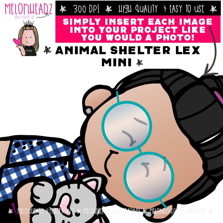 Animal Shelter clip art, Lex, pets, Melonheadz Characters Mini: This illustrated set contains all of the clip art images as shown in the preview picture. COLORED and BLACK AND WHITE illustrations included.
