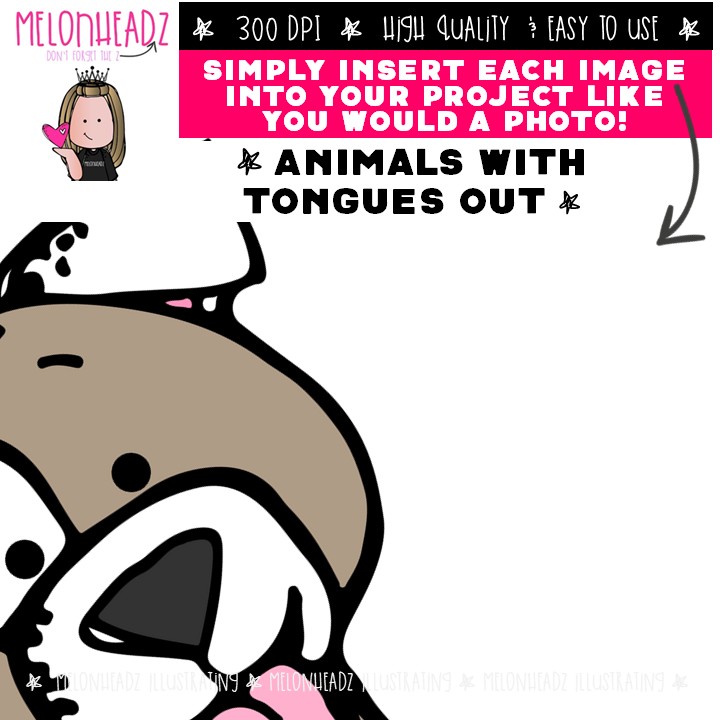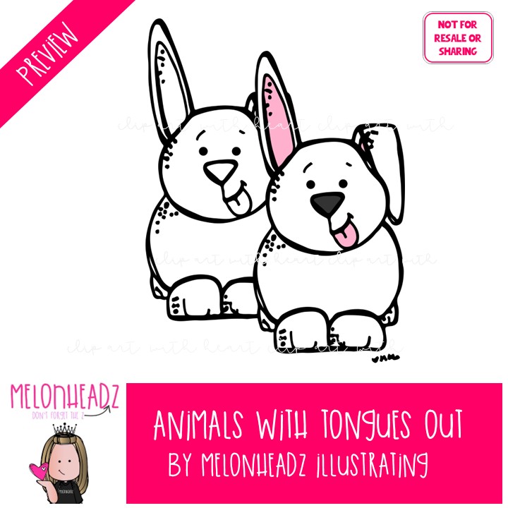 Animals with tongues out clip art Mini: This illustrated set contains all of the clip art images as shown in the preview picture. COLORED and BLACK AND WHITE illustrations included.