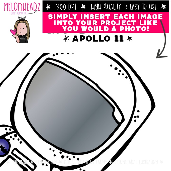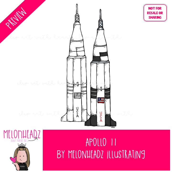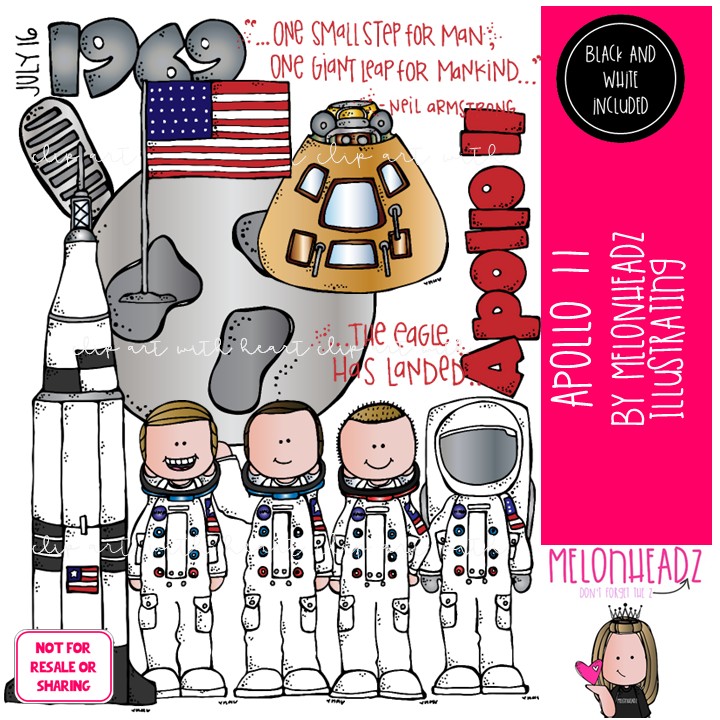 Apollo 11 clip art, Moon Landing clip art, Space clip art COMBO PACK: This illustrated set contains all of the clip art images as shown in the preview picture. COLORED and BLACK AND WHITE illustrations included.