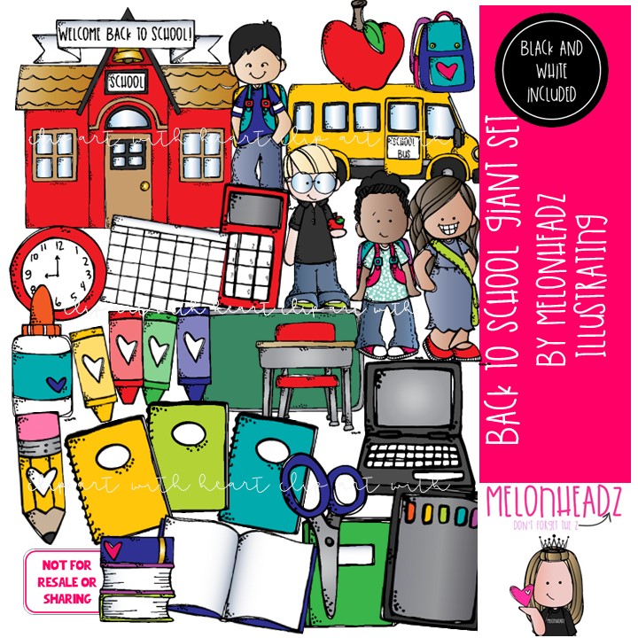 Back to School clip art, school bus clip art GIANT set: This illustrated set contains all of the clip art images as shown in the preview picture. COLORED and BLACK AND WHITE  illustrations included.