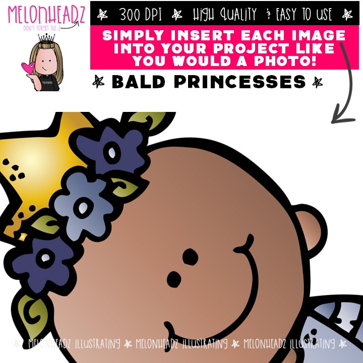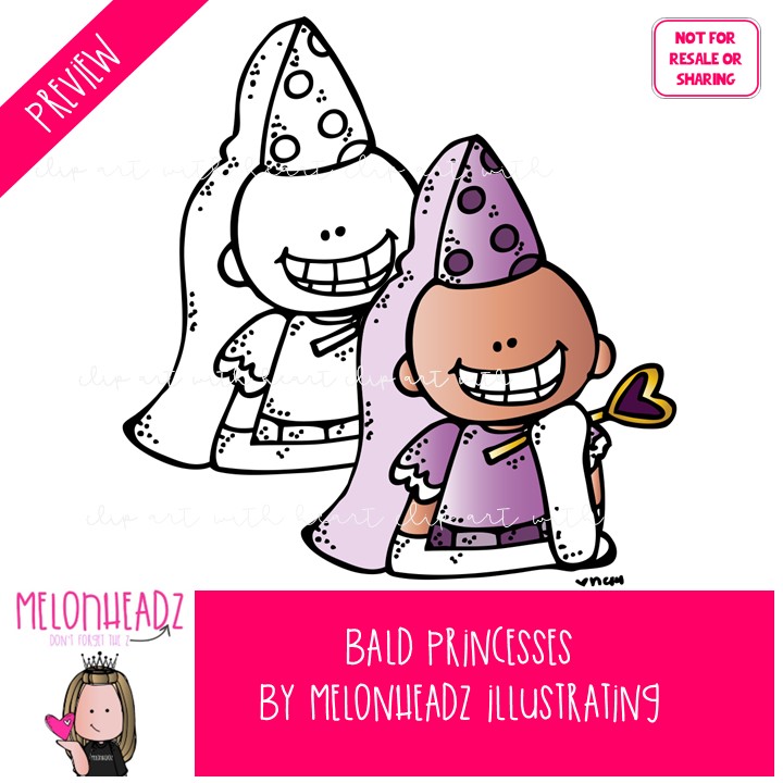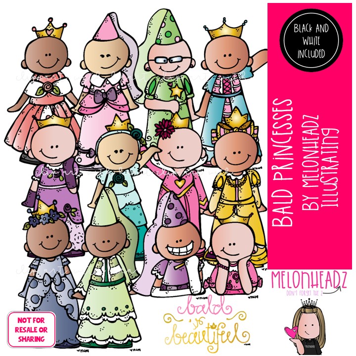 Bald Princesses clip art, Bald Kidlettes clip art, Alopecia clip art COMBO PACK: This illustrated set contains all of the clip art images as shown in the preview picture. COLORED and BLACK AND WHITE  illustrations included.