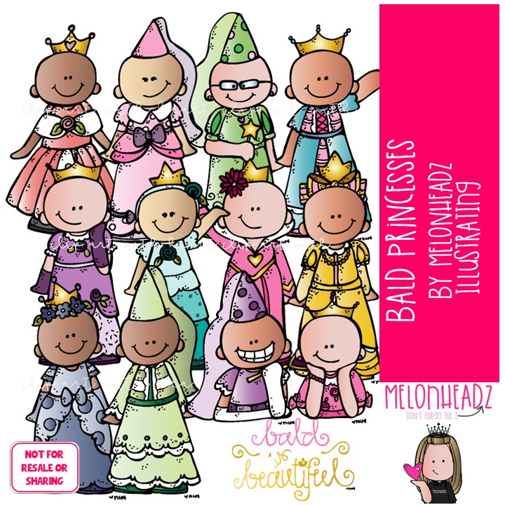 Bald Princesses clip art, Bald Kidlettes clip art, Alopecia clip art COLORED Version