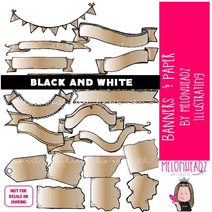 Banners and Paper clip art, blank, parchment BLACK AND WHITE: This illustrated set contains all of the clip art images as shown in the preview picture. BLACK AND WHITE illustrations included.