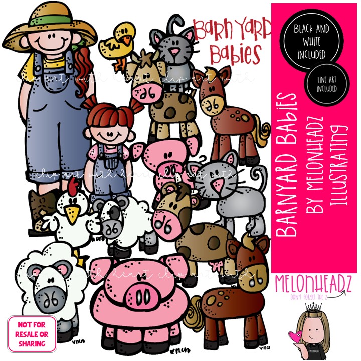 Barnyard Babies clip art, farm, animals COMBO PACK: This illustrated set contains all of the clip art images as shown in the preview picture. COLORED, BLACK AND WHITE and LINE ART illustrations included.