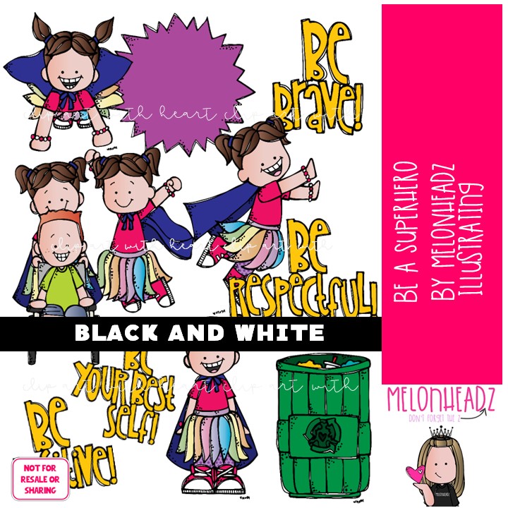 Be a Superhero clip art, literature, book companion BLACK AND WHITE: This illustrated set contains all of the clip art images as shown in the preview picture. BLACK AND WHITE illustrations included.