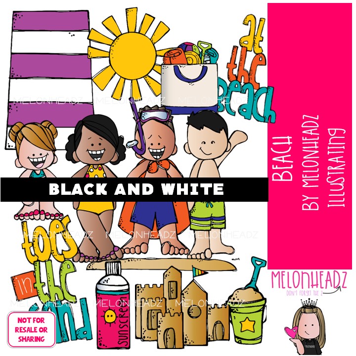 Beach clip art, sand, vacation, BLACK AND WHITE: This illustrated set contains all of the clip art images as shown in the preview picture. BLACK AND WHITE illustrations included.