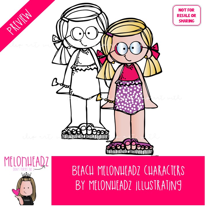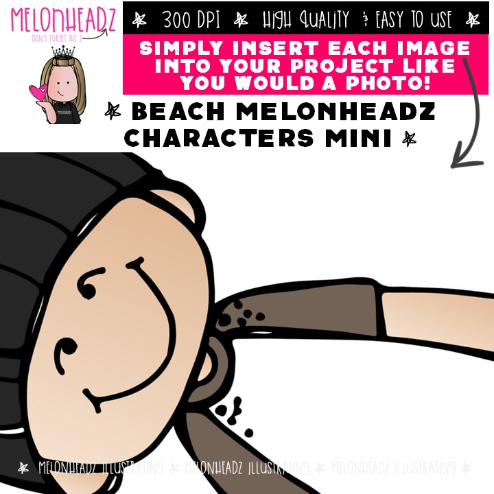 Beach clip art, Melonheadz Characters, background Mini: This illustrated set contains all of the clip art images as shown in the preview picture. COLORED and BLACK AND WHITE illustrations included.