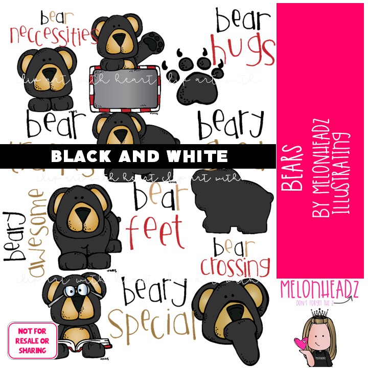 Bears clip art, black, word art BLACK AND WHITE: This illustrated set contains all of the clip art images as shown in the preview picture. BLACK AND WHITE illustrations included.