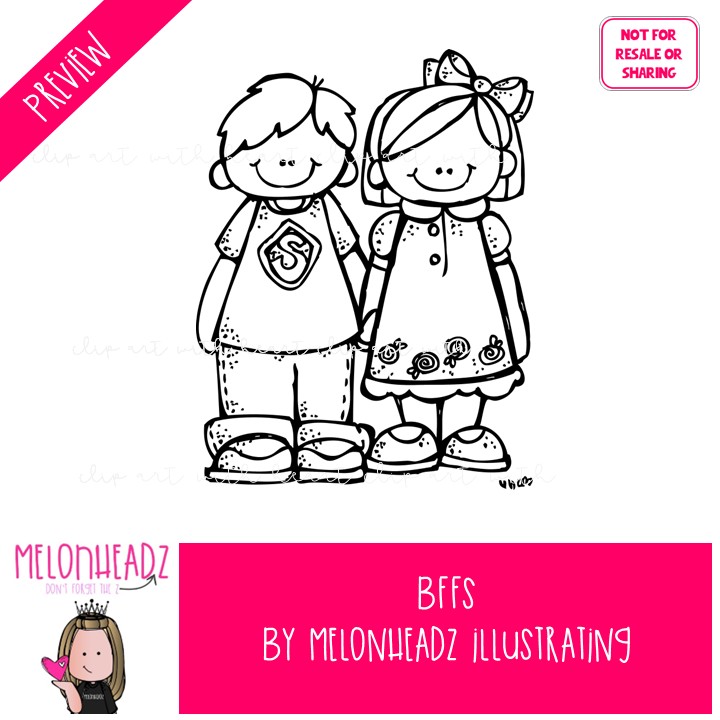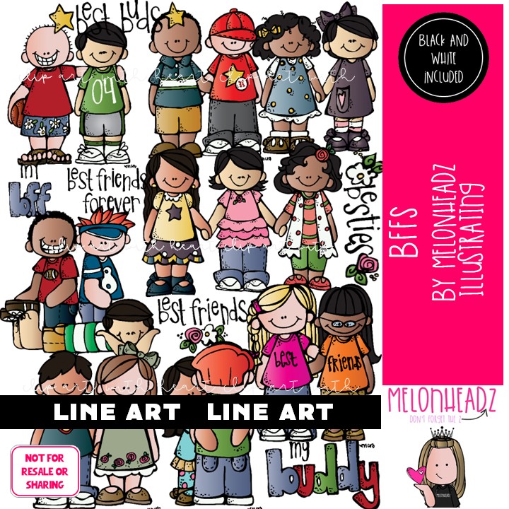 BFFS clip art, Best Friends, kids LINE ART and BLACK AND WHITE: This illustrated set contains all of the clip art images as shown in the preview picture. LINE ART and BLACK AND WHITE illustrations included.