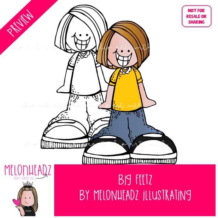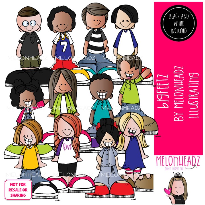 Bigfeetz clip art, kids COMBO PACK: This illustrated set contains all of the clip art images as shown in the preview picture. COLORED and BLACK AND WHITE illustrations included.