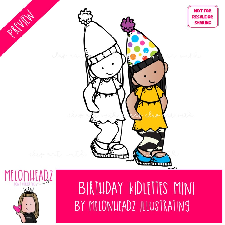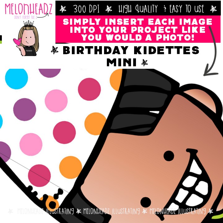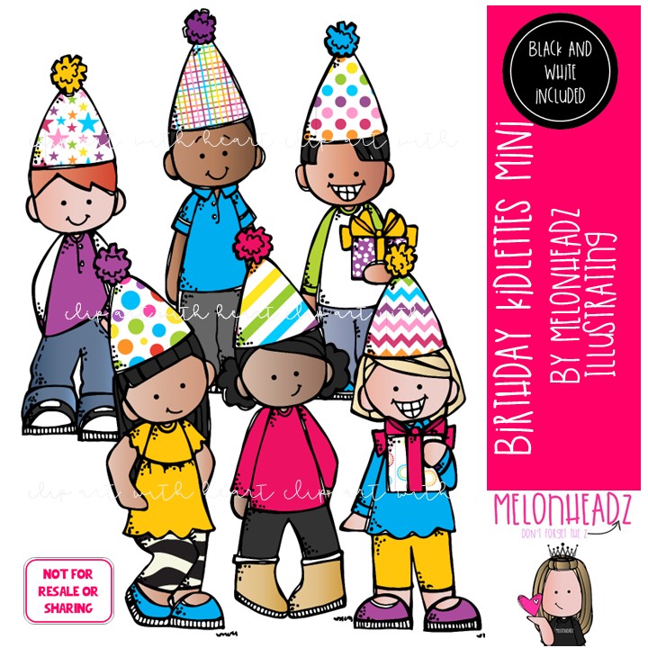 Birthday Kidlettes clip art, party MINI: This illustrated set contains all of the clip art images as shown in the preview picture. COLORED and BLACK AND WHITE illustrations included.