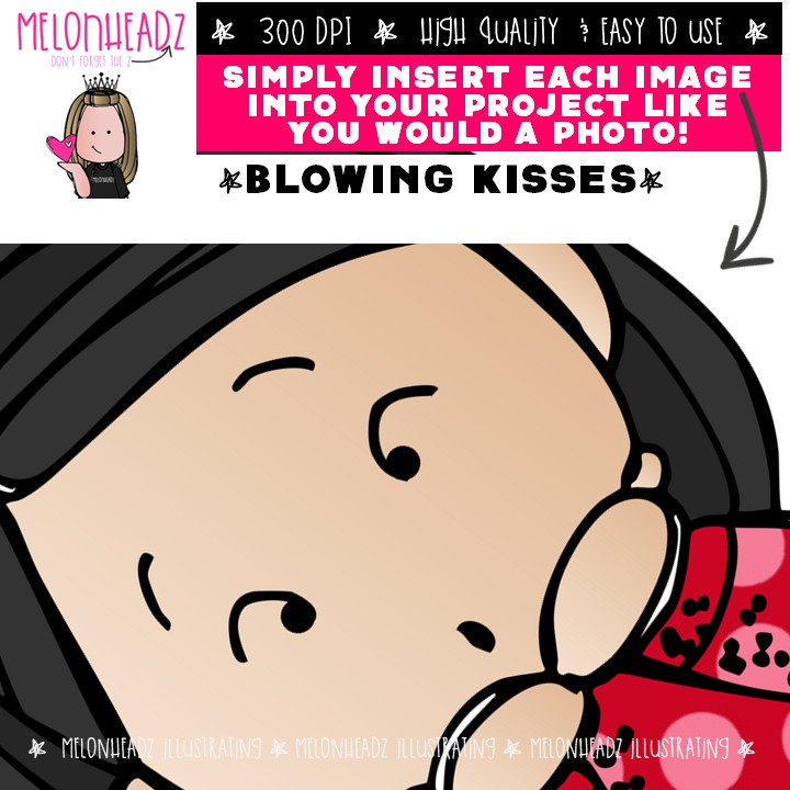 Blowing kisses clip art, Valentine’s Day Mini: This illustrated set contains all of the clip art images as shown in the preview picture. COLORED and BLACK AND WHITE illustrations included.
