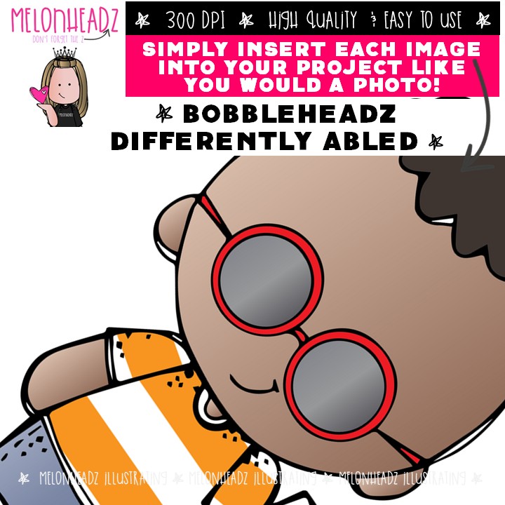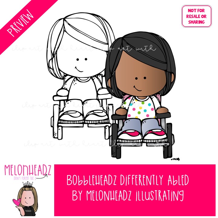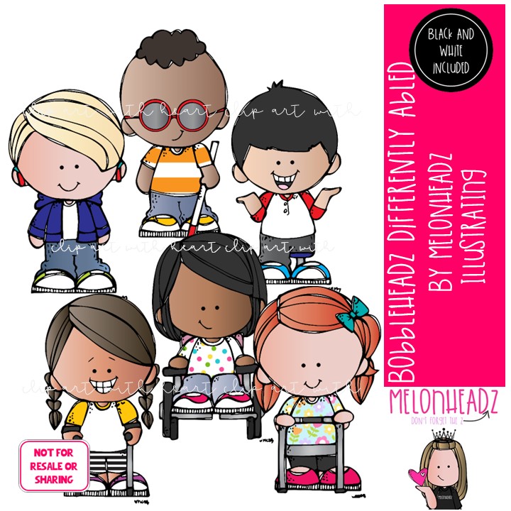 Bobbleheadz clip art, Differently Abled Mini: This illustrated set contains all of the clip art images as shown in the preview picture. COLORED and BLACK AND WHITE illustrations included.