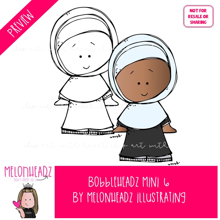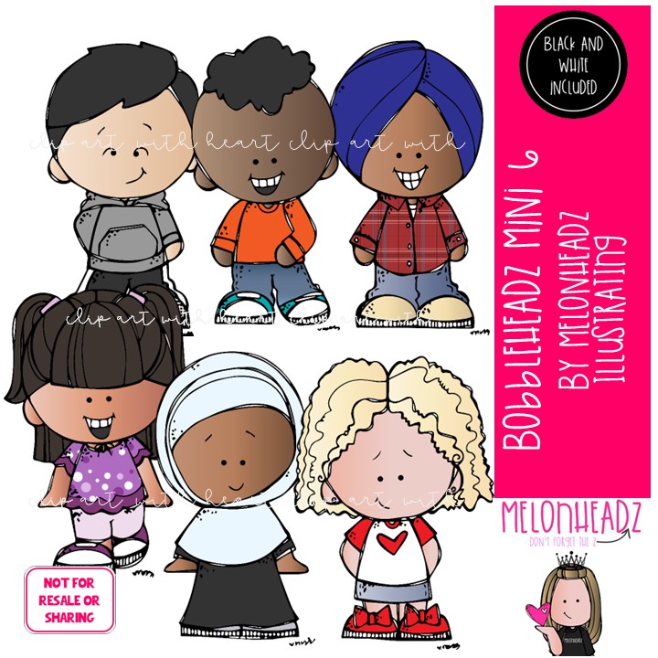 Bobbleheadz 6 clip art, kid Mini: This illustrated set contains all of the clip art images as shown in the preview picture. COLORED and BLACK AND WHITE illustrations included.