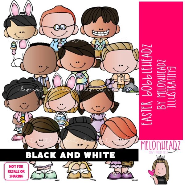 Easter clip art Bobbleheadz clip art Spring clip art BLACK AND WHITE: This illustrated set contains all of the clip art images as shown in the preview picture. BLACK AND WHITE illustrations included.