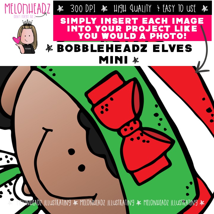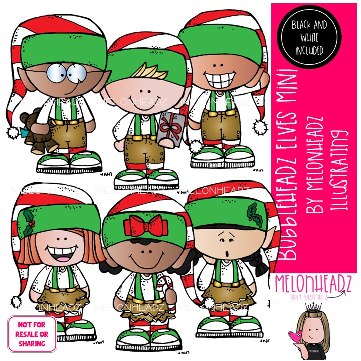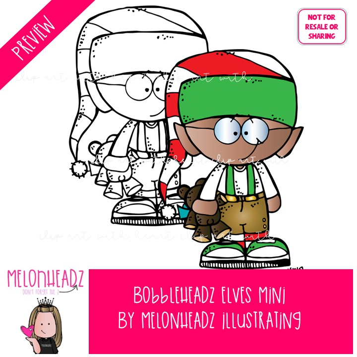 Bobbleheadz Elves clip art, Christmas clip art Mini: This illustrated set contains all of the clip art images as shown in the preview picture. COLORED and BLACK AND WHITE illustrations included.