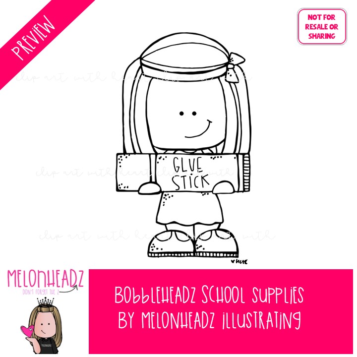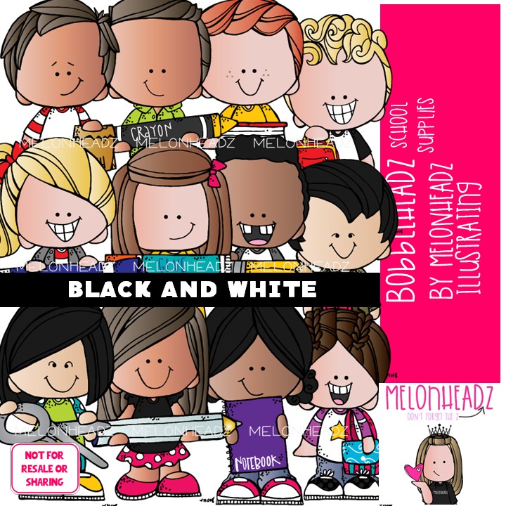 Bobbleheadz clip art School Supplies clip art BLACK AND WHITE: This illustrated set contains all of the clip art images as shown in the preview picture. BLACK AND WHITE  illustrations included.