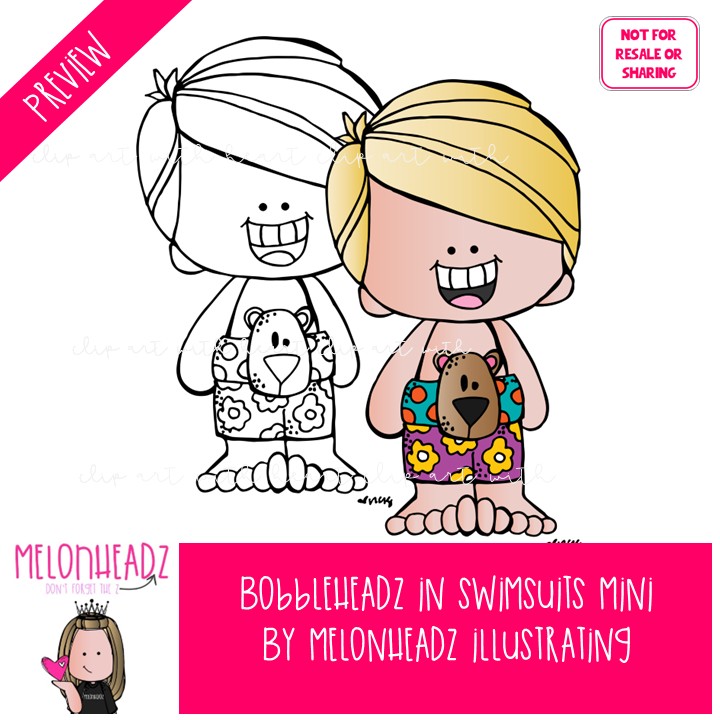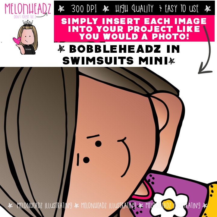 Bobbleheadz clip art, Swimsuits, Summer Mini: This illustrated set contains all of the clip art images as shown in the preview picture. COLORED and BLACK AND WHITE illustrations included.