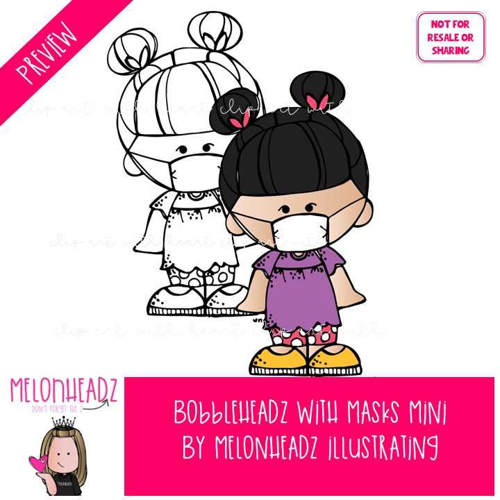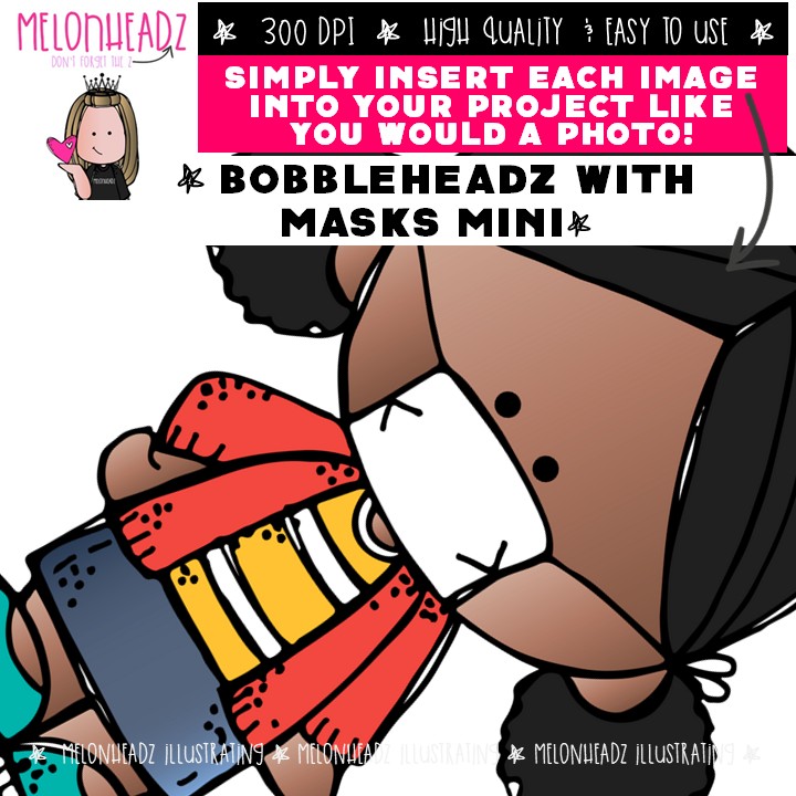 Bobbleheadz clip art, facemasks, PPE Mini: This illustrated set contains all of the clip art images as shown in the preview picture. COLORED and BLACK AND WHITE illustrations included.