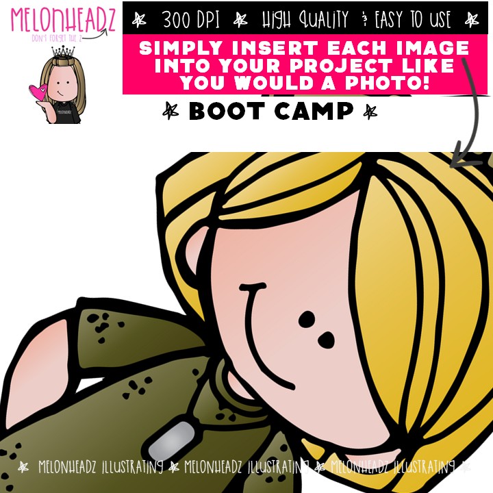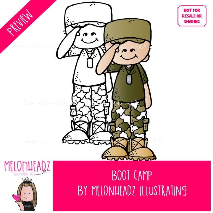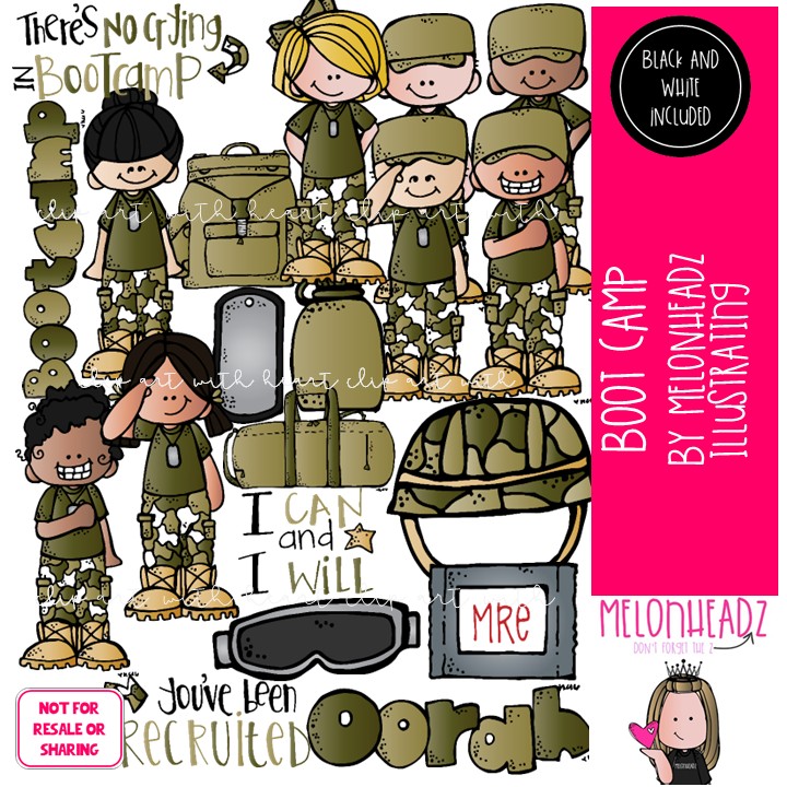 Boot Camp clip art, military, patriotic COMBO PACK: This illustrated set contains all of the clip art images as shown in the preview picture. COLORED and BLACK AND WHITE illustrations included.
