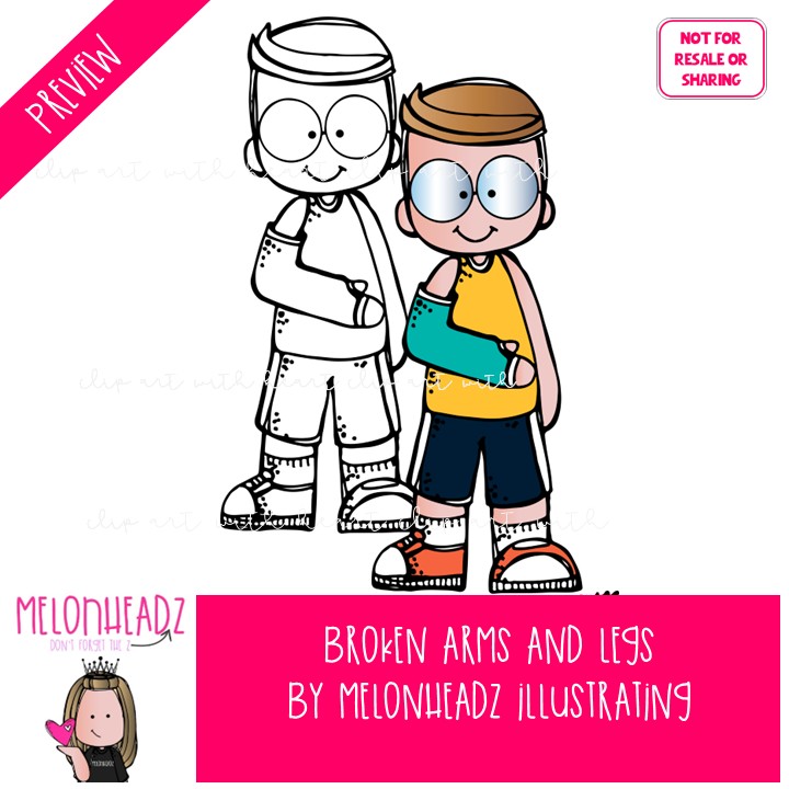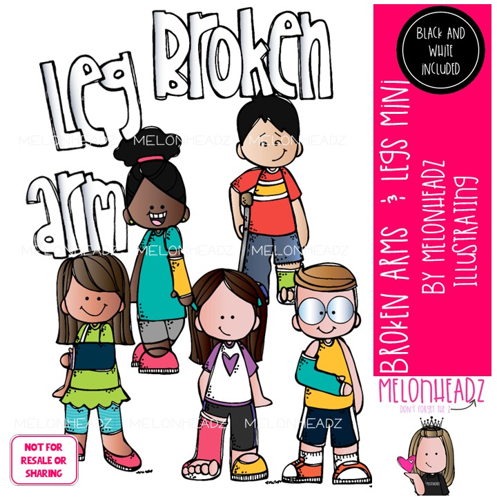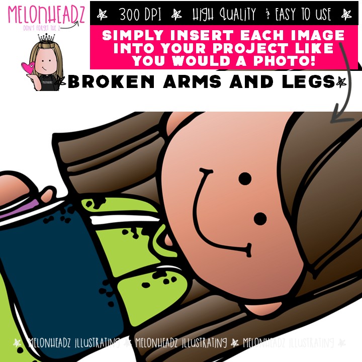 Broken arm and leg clip art, medical, get well Mini: This illustrated set contains all of the clip art images as shown in the preview picture. COLORED and BLACK AND WHITE illustrations included.