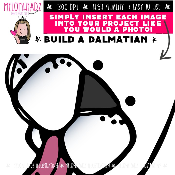 Build A Dalmatian clip art, dog, sequence COLORED Version: This illustrated set contains all of the clip art images as shown in the preview picture. COLORED illustrations included.