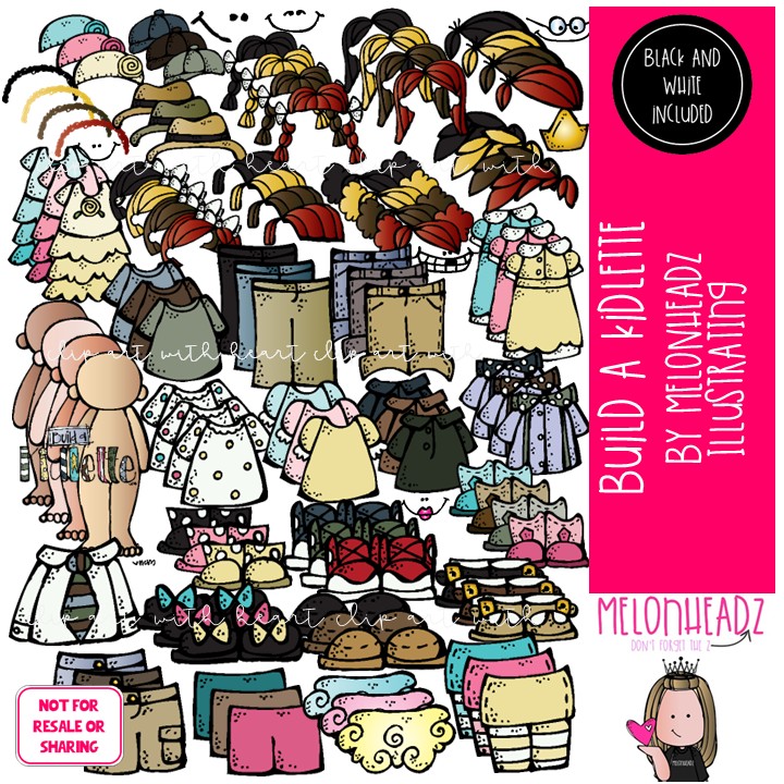 Build A Kidlette clip art, digital paper doll, body COMBO PACK: This illustrated set contains all of the clip art images as shown in the preview picture. COLORED and BLACK AND WHITE illustrations included.
