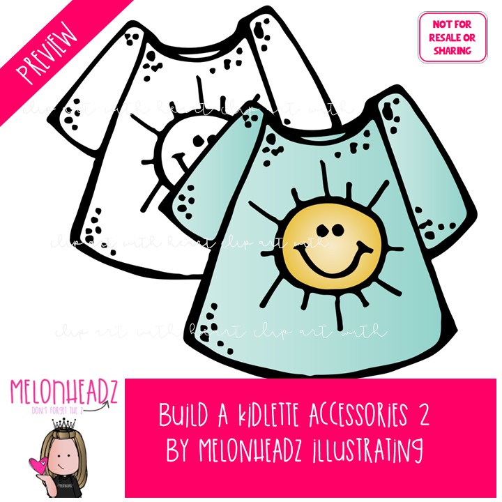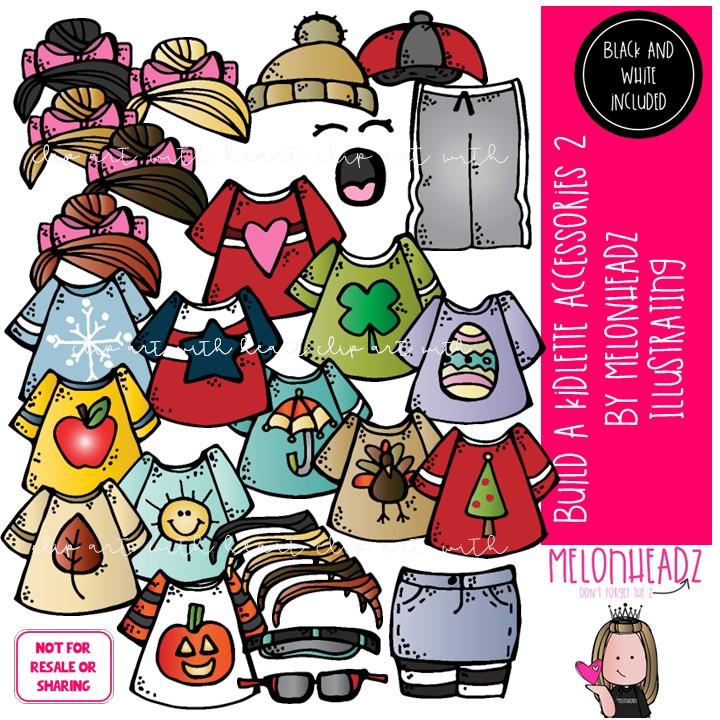 Build A Kidlettes Accessories clip art Set 2, Build A Kid clip art COMBO PACK: This illustrated set contains all of the clip art images as shown in the preview picture. COLORED and BLACK AND WHITE illustrations included.