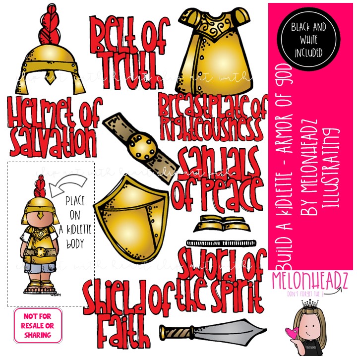 Build A Kidlette clip art, Armor of God clip art COMBO PACK: This illustrated set contains all of the clip art images as shown in the preview picture. COLORED and BLACK AND WHITE illustrations included.