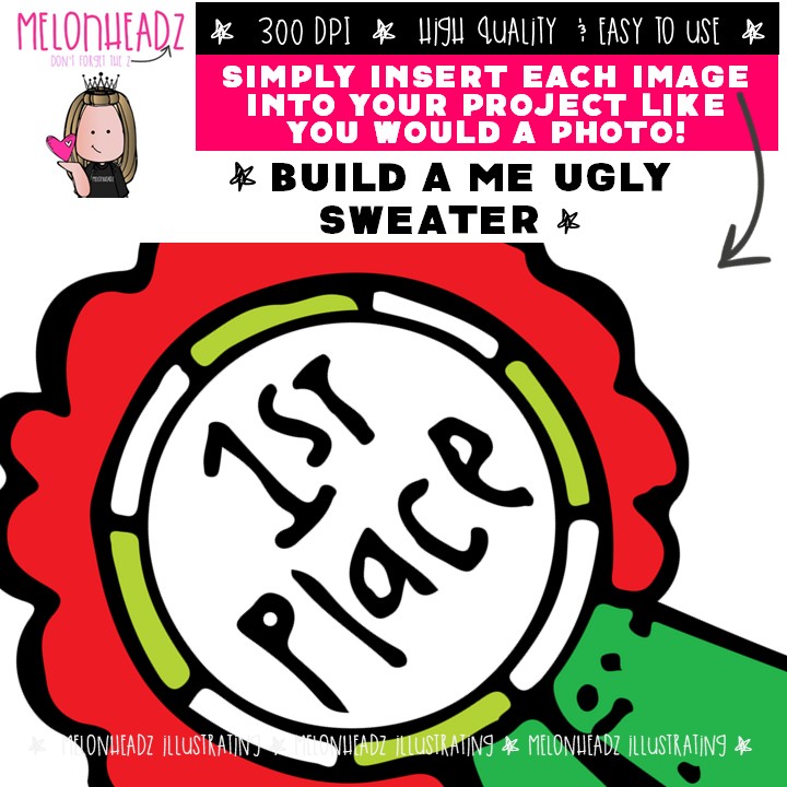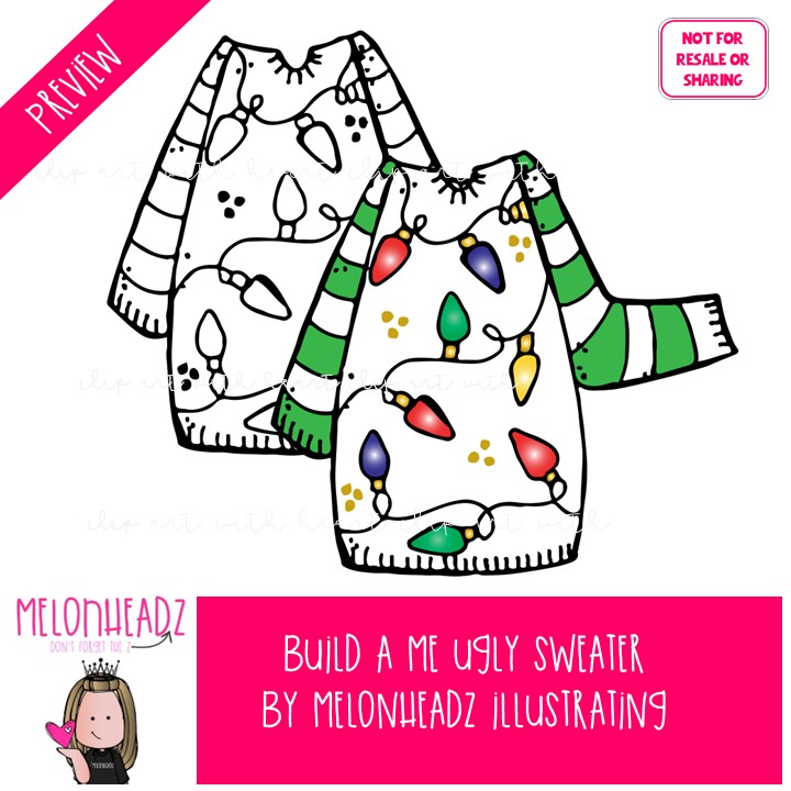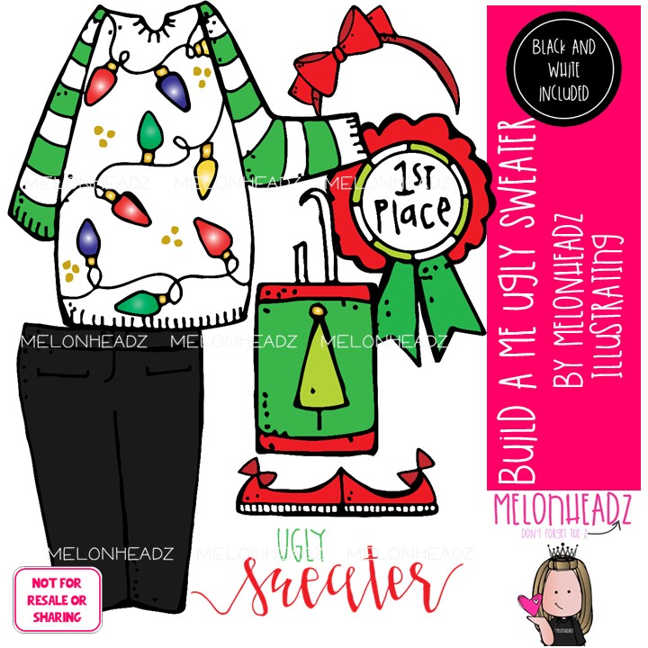 Build a Me clip art, Christmas clip art, Ugly Sweater clip art Mini: This illustrated set contains all of the clip art images as shown in the preview picture. COLORED and BLACK AND WHITE illustrations included.