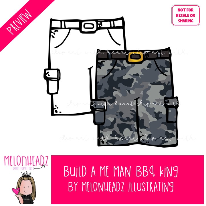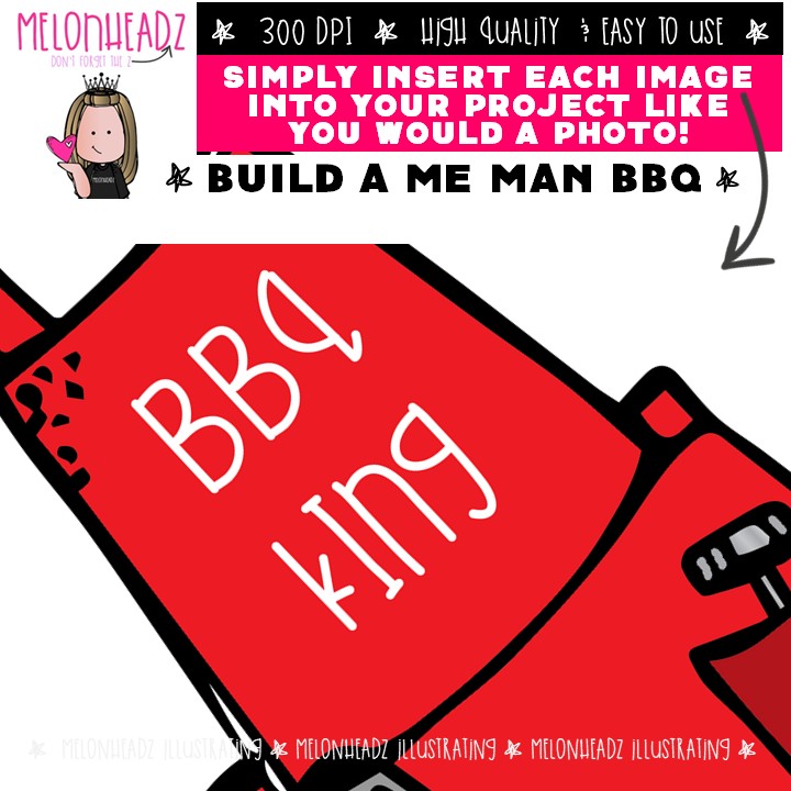 Build a Me Man clip art, BBQ King clip art COMBO PACK: This illustrated set contains all of the clip art images as shown in the preview picture. COLORED and BLACK AND WHITE illustrations included.