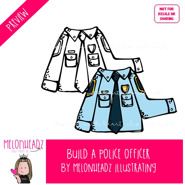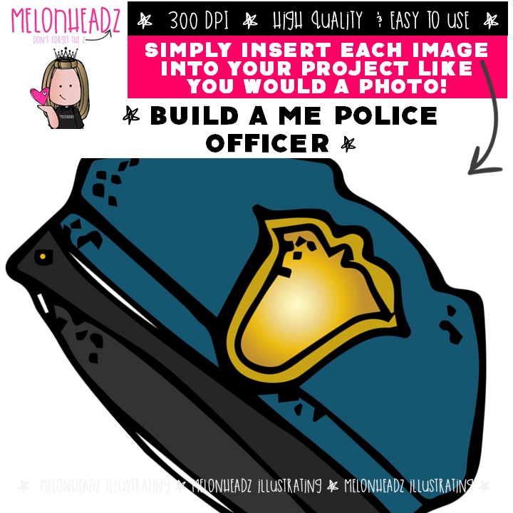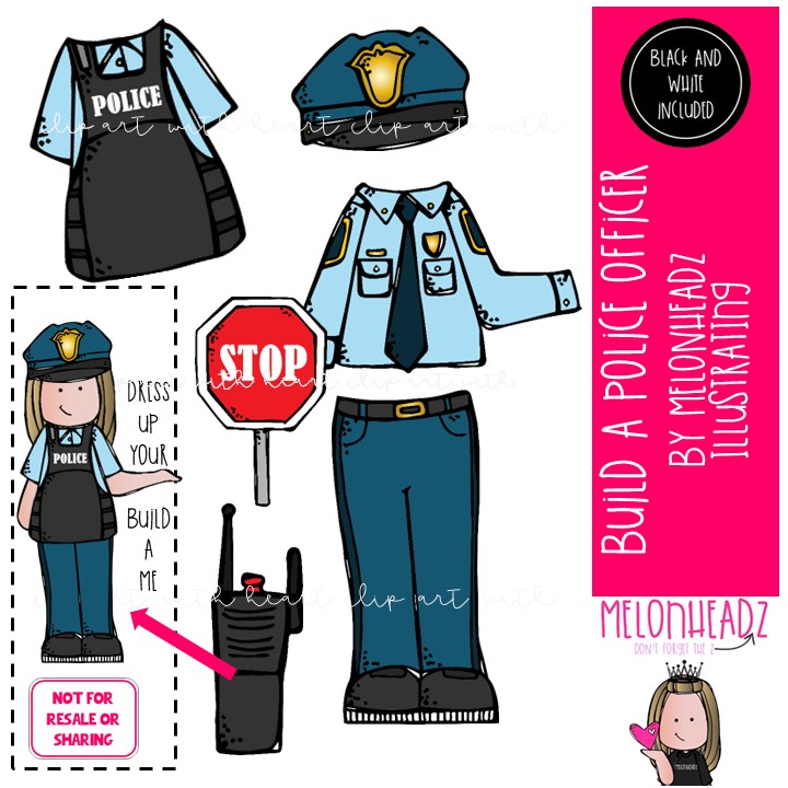 Build A Police Officer clip art, Build A Me, Teacher, digital paper doll Mini, PNG: This illustrated set contains all of the clip art images as shown in the preview picture. COLORED and BLACK AND WHITE illustrations included.