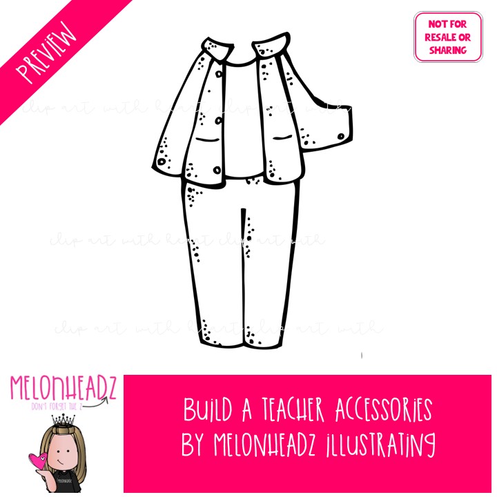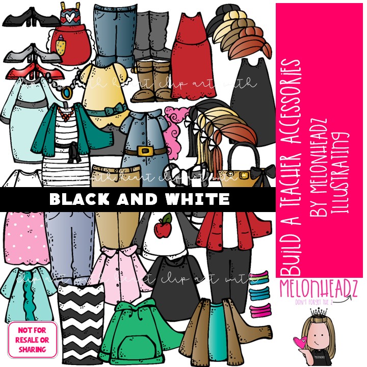 Build a Teacher Accessories clip art, Me, digital paper doll BLACK AND WHITE: This illustrated set contains all of the clip art images as shown in the preview picture. BLACK AND WHITE illustrations included.
