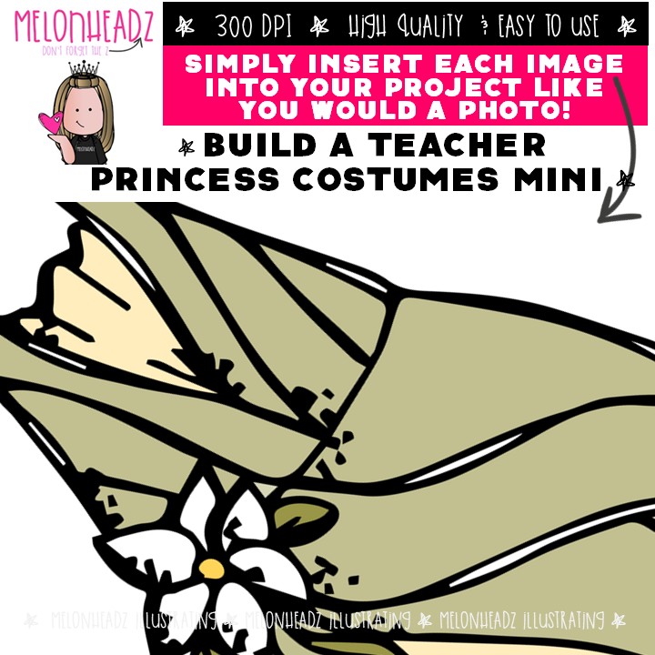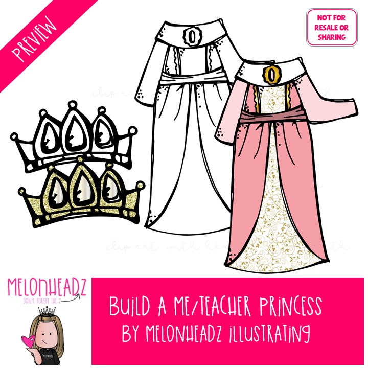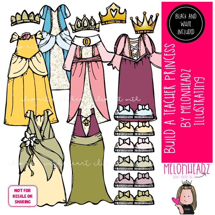 Build A Teacher clip art, Me, Princess Costumes, Halloween COMBO PACK: This illustrated set contains all of the clip art images as shown in the preview picture. COLORED and BLACK AND WHITE illustrations included.