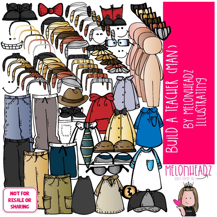 Build a Teacher clip art, Man, digital paper doll COLORED Version: This illustrated set contains all of the clip art images as shown in the preview picture. COLORED illustrations included.
