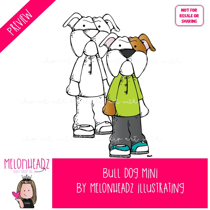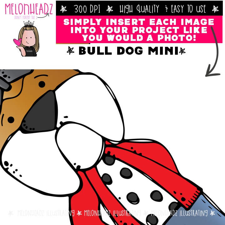 Bulldog clip art, mascot, pet Mini: This illustrated set contains all of the clip art images as shown in the preview picture. COLORED and BLACK AND WHITE illustrations included.