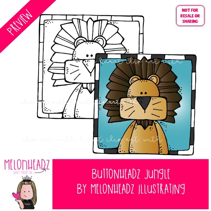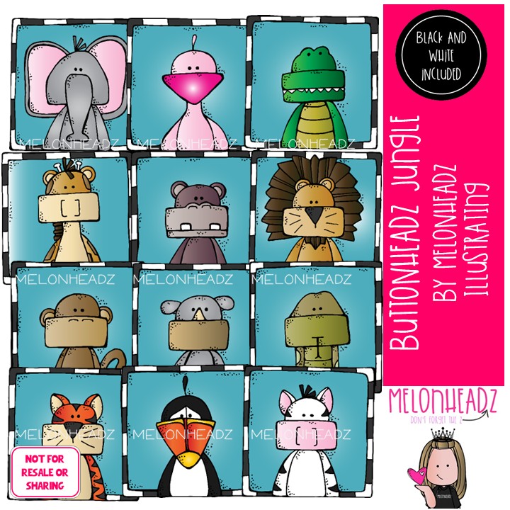 Buttonheadz clip art, Jungle animals, safari, zoo COMBO PACK: This illustrated set contains all of the clip art images as shown in the preview picture. COLORED and BLACK AND WHITE illustrations included.